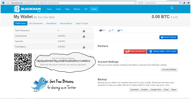 Silahkan daftar di SINI, untuk cara membuat wallet anda bisa baca di cara membuat wallet di blockchain, jika sudah mendaftar, akan mempunyai alamat wallet bitcoin, untuk mengetahui alamat wallet bitcoin, anda bisa login dahulu menggunakan kode identifier dan password yang dibuat tadi, maka anda dapat melihat alamat wallet seperti gambar berikut :